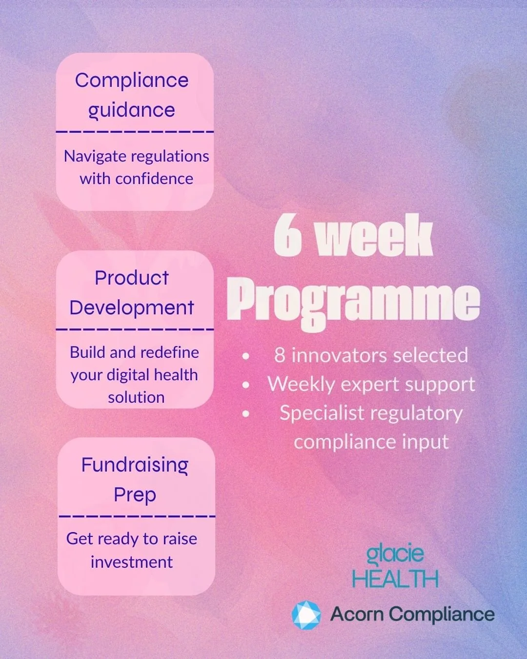 That's why Glacie Health, together with leading partners, is launching the Glacie FemTech Accelerator, designed to equip 8 early-stage Femtech teams with the strategic support, expert guidance, and practical frameworks you need to move from early-stage idea to market-ready product.